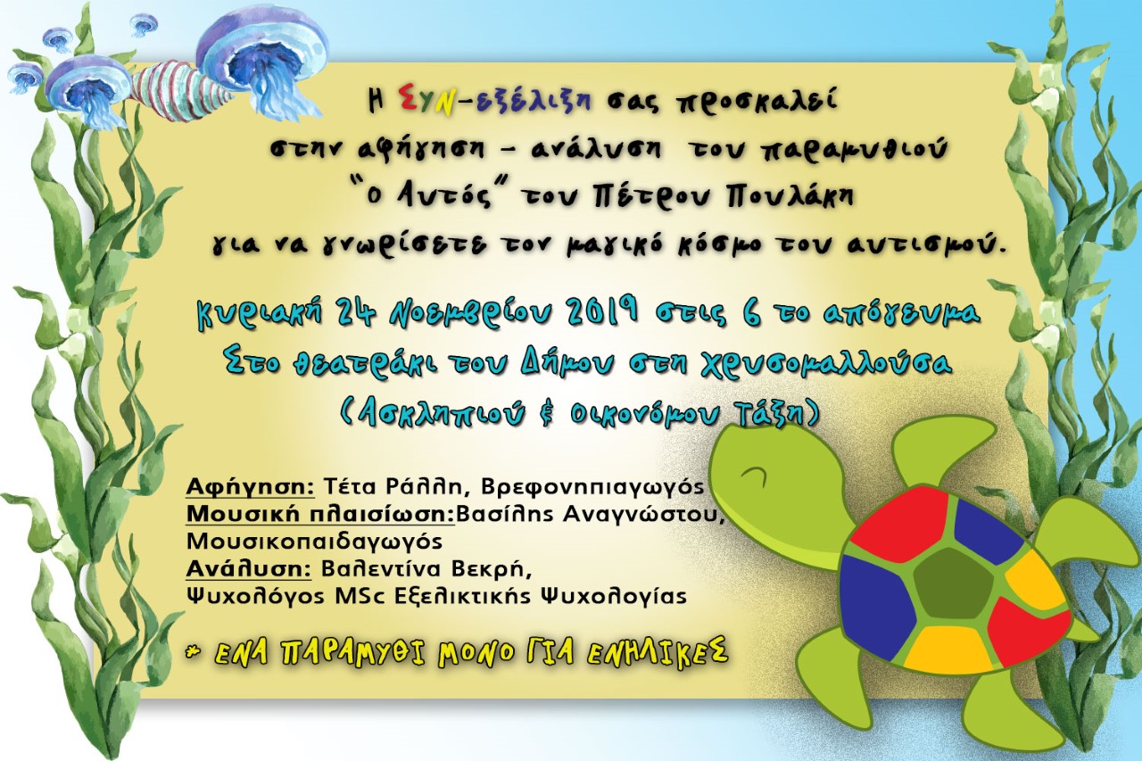 Η ΣΥΝ-εξέλιξη διοργανώνει μια αφήγηση-ανάλυση του παραμυθιού «Ο Αυτός» του Πέτρου Πουλάκη την Κυριακή 24 Νοεμβρίου στις 6 το απόγευμα στο θεατράκι του δήμου στην Χρυσομαλλούσα.